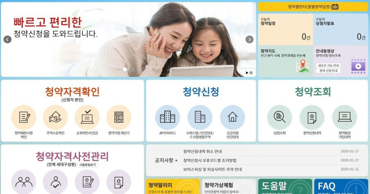 아파트분양 청약일정 제공 청약신청 청약자격확인 당첨자조회 분양 아파트/평형별 신청경쟁률 확인 관심지역 알림서비스 인근시세 지도서비스 불법분양권공시내역 서비스 청약통계 현황 규제지역정보 청약홈 사이트의 앱버전입니다.